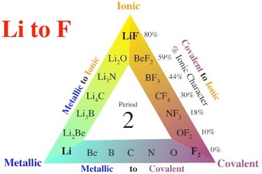 There are three main types of bonding. This triangle uses the extremes of Lithium and Flourine to illustrate the relative strengths of bonding in simple compounds.