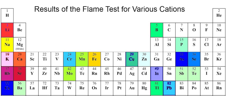 If atoms are made more excited, usually by heating but it can be useful in electronics eg TVs, when the atom drops back into its unexcited state nanoseconds later it releases its energy dependent on the size of the gap between energy levels which is fixed per element. Quite a few elements do this in the visible spectrum. These colours can be seen by exposing a compound, containing the following metals, to the extremes of heat in a suitable flame eg bunsen burner. The the colours seen are shown..