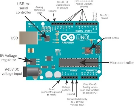 There are quite a number of variants of the basic theme. The most commonly used is the Uno which has 14 digital input/output pins (of which 6 can be used as PWM outputs), 6 analog inputs, a USB controller, an ICSP header and a reset button.
