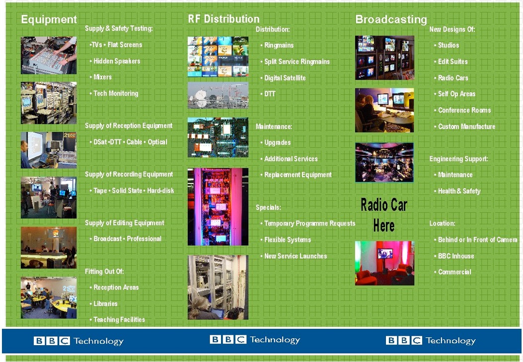 An original idea by Paul Longthorpe the team provided design, install, maintenance and a front line support service for both BBC and non-BBC clients in the UK and overseas. The systems integration team oversaw medium size projects like: