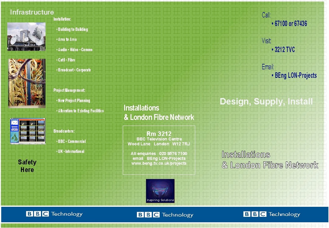 Projects include, Multimedia TV studio for News Interactive/ News Online, training studio for BBC Weather, Newsroom, editing & graphics for Liquid News, TC11 gallery refit, monitoring room for BBC Freeview, roof cameras for the Politics Show, London installation for K Live subtitling system, RF headend relocation for White City building, design of complete RF distribution for BBC Broadcast White City Two building ( 1 million meters of cable ), Coding & Mux test area ( Freeview), Regional AV installations at all main sites for News Online/Sport Online, Safety testing for CCA/ DTA/CDTA at TVC, BBC News, New Media at Bush House, Overseas Bureaux.