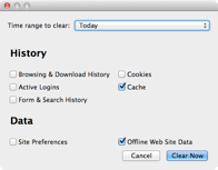 2. On the top menu click History and drop down to Clear Recent History (see right). Ensure that history Cache checked and the Offline Web Site Data is checked. The Time Range To Clear isn’t used so can be anything you like. Hit Clear Now.