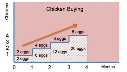 This may sound alien to you. However Mrs Smith can’t afford to buy a whole lot of chickens all at once. However the clever lady decides to set aside the savings she’s making and buy one more chicken per month. The obvious question is: How soon will they become self-sufficient ?