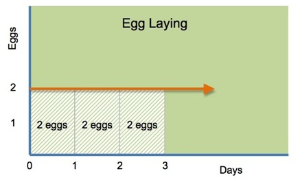 So how many eggs will Mrs Smith have after three days ? On day 1 she gets two eggs, on day 2 she gets two eggs and on day 3 she gets two eggs. This process is called Integration and is best imagined as a graph. The graph would show a simple horizontal straight line (and so is called a First Order Equation). The total number of eggs is increasing and is given by the area under the graph.